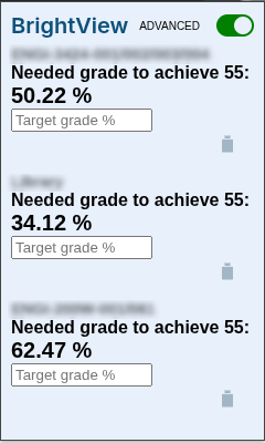 BrightView augments the Brightspace grade interface with client-side analysis tools. The extension parses grade data from the page DOM and performs local calculations to generate additional insights such as target-grade projections and aggregated performance summaries. Two operating modes are provided: Basic Mode Displays a clean overview of current course averages. Advanced Mode Allows students to specify target grades and calculates the required performance needed to reach those outcomes. All analysis occurs locally within the browser session and requires no external services or backend infrastructure.