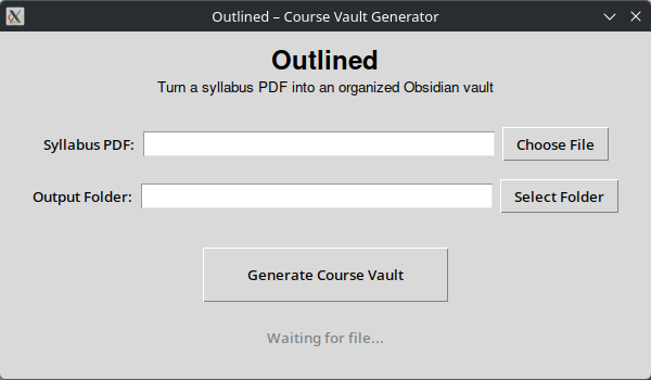Outlined is a tool that transforms course outline PDFs into fully structured Obsidian course vaults. University course outlines contain essential information such as units, assignments, and important dates, but students typically have to manually organize this information for studying. Outlined automatically extracts these sections from a syllabus and generates a ready-to-use study vault with organized notes, unit folders, and structured templates for efficient exam preparation.